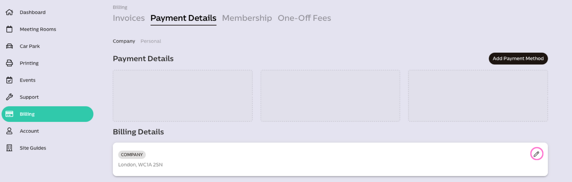 You can update your company's billing address by going to the Payment Details page on the portal. Click the pencil icon to change your info.